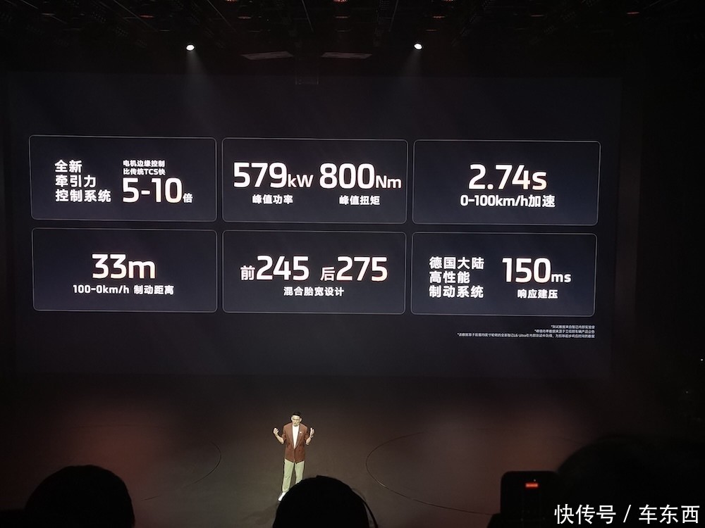 此外,新车在动力表现上也可圈可点,四驱版峰值功率为579kW,峰值扭矩为800Nm,零百加速仅需2.74s,百公里最短刹停距离仅33m。同时,新车全系配备800V高压平台和全新一代超高效飓风电机,百公里能耗为11.8kWh。