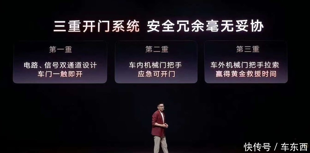 针对汽车碰撞后无法开门问题,全新智己L6还做了三重开门系统,并且把低压电源放在车尾最坚固的地方,以及解锁域控放在乘员舱最坚固的A柱下方,进一步避免了无法开门的风险。